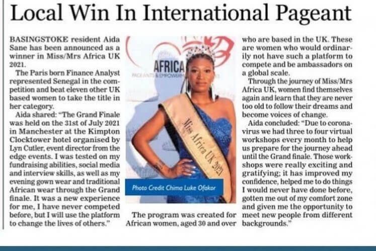 She won the 1st edition of Miss/Mrs Africa UK 2021, out of a record number of entries received by the organisation. She was competing against 11 other women of African origin from across the UK, representing her country of origin Senegal. She is of the Diola ethnic group from Zinguinchor, Casamance in the south of Senegal.