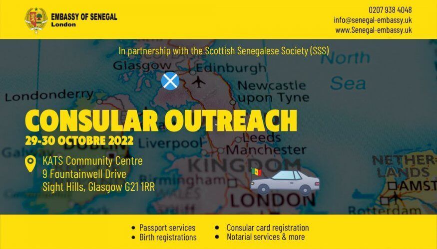 Une équipe de l’Ambassade du Sénégal à Londres se rendra à Glasgow en Ecosse du 29 au 30 octobre 2022 pour receivoir les demandes de passeports, laissez-passer, cartes d’identité consulaire, legalisations et documents d’état-civil. Cette mission se réalisera en collaboration avec une association sénégalaise basée à Edinburgh dénommée Senegalese Scottish Society pour coïncider avec son assemblée générale qu’elle tient également le samedi 29 octobre 2022 à Glasgow à partir de midi.