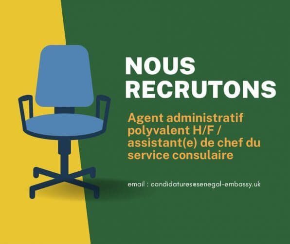 Emploi à temps plein à l’Ambassade du Sénégal à Londres Un Agent administratif polyvalent H/F / assistant(e) de chef du service consulaire A pourvoir au 1 avril 2023 Présentation du poste Fonction – Assistant du chef de…